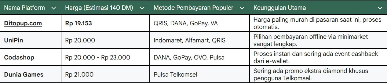 Berikut adalah perbandingan harga untuk paket standar (sekitar 140 Diamond) dari berbagai platform resmi. Jika kamu mencari yang paling murah, Ditopup.com saat ini memegang rekor harga terendah.
